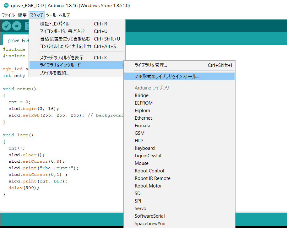まずGrove LCDのドライバをArduino IDEにインストールします。