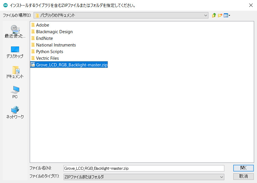 ファイルを選択するダイアログが開くので、LCDドライバのzipファイルを選択してください。これでライブラリを使えるようになります。