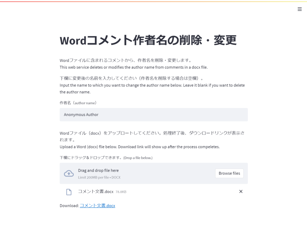 ページ下方に別の欄(灰色背景)がありますが、ここにコメントが入ったWordファイルをドラッグ&ドロップすると、コメント作者名を変更する処理が行われます。処理後、ダウンロードリンクが現れるので、それをクリックしてファイルをダウンロードしてください。