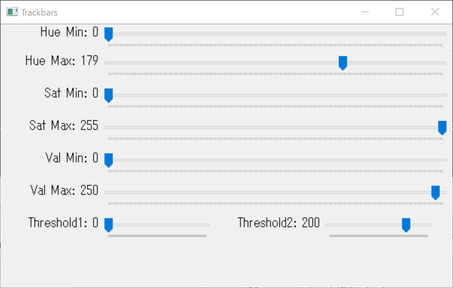#====================================================================== # トラックバーの作成 #====================================================================== cv2.namedWindow("Trackbars") cv2.resizeWindow("Trackbars", 600, 350) cv2.createTrackbar("Hue Min", "Trackbars", 0, 255, nothing); cv2.createTrackbar("Hue Max", "Trackbars", 179, 255, nothing); cv2.createTrackbar("Sat Min", "Trackbars", 0, 255, nothing); cv2.createTrackbar("Sat Max", "Trackbars", 255, 255, nothing); cv2.createTrackbar("Val Min", "Trackbars", 0, 255, nothing); cv2.createTrackbar("Val Max", "Trackbars", 250, 255, nothing); cv2.createTrackbar("Threshold1", "Trackbars", 0, 255, nothing); cv2.createTrackbar("Threshold2", "Trackbars", 200, 255, nothing); |