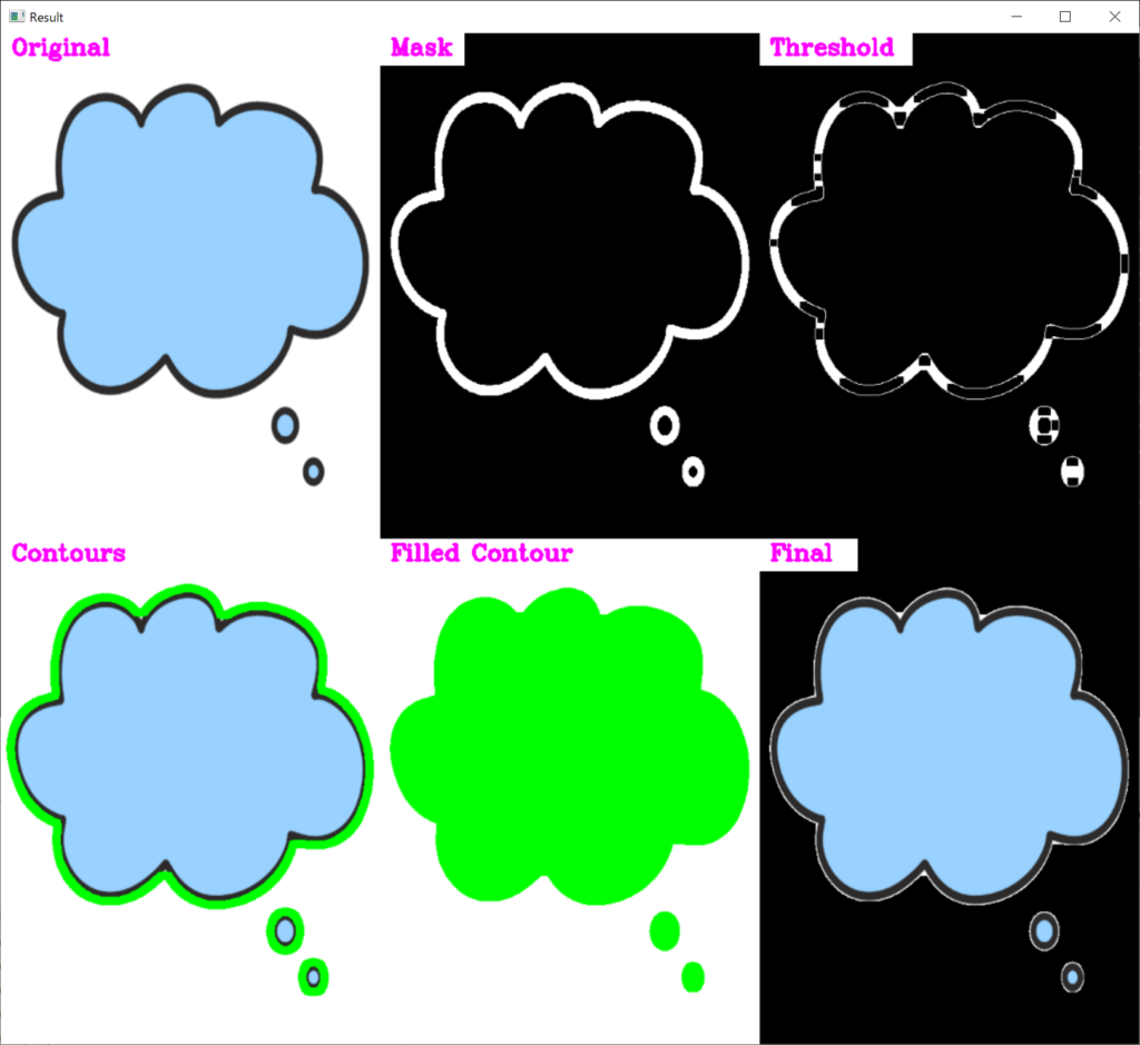 b_save = False while True: val = valTrackbars() #================================================================== # プリプロセッシング #================================================================== imgMask = cv2.inRange(imgHSV, (val[0], val[2], val[4]), (val[1], val[3], val[5])) # ガウシアンブラーをかけてぼやかす imgBlur = cv2.GaussianBlur(imgMask, (5, 5), 1) # エッジを検出する imgThreshold = cv2.Canny(imgBlur, val[6], val[7]) # 以下の2処理は必須ではないが、画像にノイズがある場合は役立つ kernel = np.ones((5, 5)) imgDial = cv2.dilate(imgThreshold, kernel, iterations=2) imgThreshold = cv2.erode(imgDial, kernel, iterations=2) #================================================================== # すべての輪郭を見つけて描画する #================================================================== imgContours = img.copy() imgFillContour = img.copy() contours, hierarchy = cv2.findContours(imgThreshold, cv2.RETR_EXTERNAL, cv2.CHAIN_APPROX_SIMPLE) cv2.drawContours(imgContours, contours, -1, (0, 255, 0), 10) # 輪郭内を緑に塗りつぶす cv2.fillPoly(imgFillContour, contours, (0, 255, 0)) # 緑の部分を白(255)にし、それ以外を黒(0)にする imgFillContourMask = np.where(imgFillContour==(0, 255, 0), 255, 0) #二値化する imgFillContourMask = cv2.inRange(imgFillContourMask, (10, 10, 10), (255, 255, 255)) imgFinal = cv2.bitwise_and(img, img, mask=imgFillContourMask) #================================================================== # #================================================================== imageArray = ([img, imgMask, imgThreshold], [imgContours, imgFillContour, imgFinal]) lables = [["Original","Mask", "Threshold"], ["Contours", "Filled Contour", "Final"]] stackedImage = stackImages(imageArray, 0.75, lables) # lablesは省略できる cv2.imshow("Result", stackedImage) key = cv2.waitKey(1) & 0xFF if key == ord('q'): break if key == ord('s'): b_save = True break |